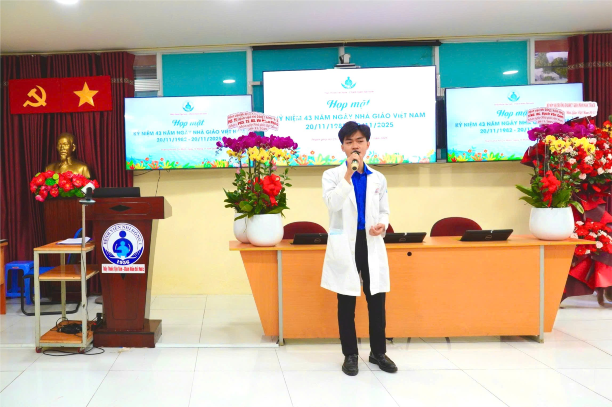 - Mở đầu chương trình họp mặt là các tiết mục văn nghệ do các bạn đoàn viên thanh niên bệnh viện chuẩn bị và trình bày. Ca khúc “Bài học đầu tiên”, sáng tác: Nhạc sĩ Trương Xuân Mẫn được BS. Hồ Nguyễn Thiện Toàn thể hiện lên những ký ức tuổi thơ, những bài học đầu đời mà dù đi đến đâu trong cuộc đời, chúng ta vẫn mãi khắc ghi. Những ký ức ấy luôn gắn liền với hình ảnh thân thương của người thầy, người cô đầu tiên, với bục giảng và những bài giảng chứa đựng tình yêu thương sâu sắc.