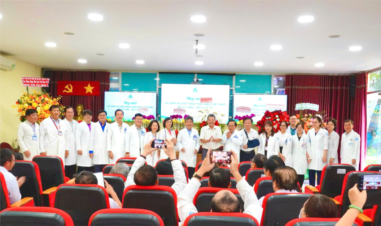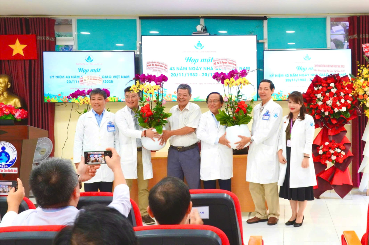 - Buổi họp mặt kỷ niệm 43 năm Ngày Nhà giáo Việt Nam khép lại trong nhiều cảm xúc khi các học viên, sinh viên các trường Y Dược đang học tập, thực hành lâm sàng, nghiên cứu khoa học tại Bệnh viện Nhi đồng 1 kính tặng những lẵng hoa tươi thắm với lòng biết ơn sâu sắc những Thầy Cô thầm lặng mang tâm hồn và trí tuệ thực hiện nhiệm vụ thiêng liêng cao quý góp sức vào sự nghiệp “trồng người”, mang trên vai sự nghiệp chăm sóc sức khỏe, giúp cho các cháu bệnh nhi vượt qua bệnh tật. Xin kính chúc Quý Thầy Cô luôn khỏe mạnh, giữ mãi ngọn lửa nhiệt huyết để tiếp tục sự nghiệp chăm sóc sức khỏe nhân dân và đào tạo những thế hệ đội ngũ nhân viên y tế cho đất nước.