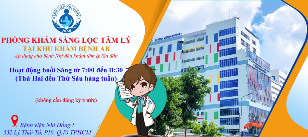 Nhằm đáp ứng nhu cầu ngày càng tăng cao của quý phụ huynh đưa trẻ đến khám tâm lý tại Bệnh viện Nhi Đồng 1, và nhằm giảm chờ khám đăng ký khám bệnh tâm lý, Bệnh viện Nhi Đồng 1 mở phòng khám Sàng lọc Tâm lý tại Khu khám bệnh AB kể từ ngày 15/3/2023 dành cho tất cả các đối tượng bệnh Nhi khám tâm lý lần đầu tại Bệnh viện Nhi Đồng 1, hoặc bệnh Nhi được chỉ định khám tâm lý tại các phòng khám Ngoại trú có thể đăng ký khám ngay trong ngày.