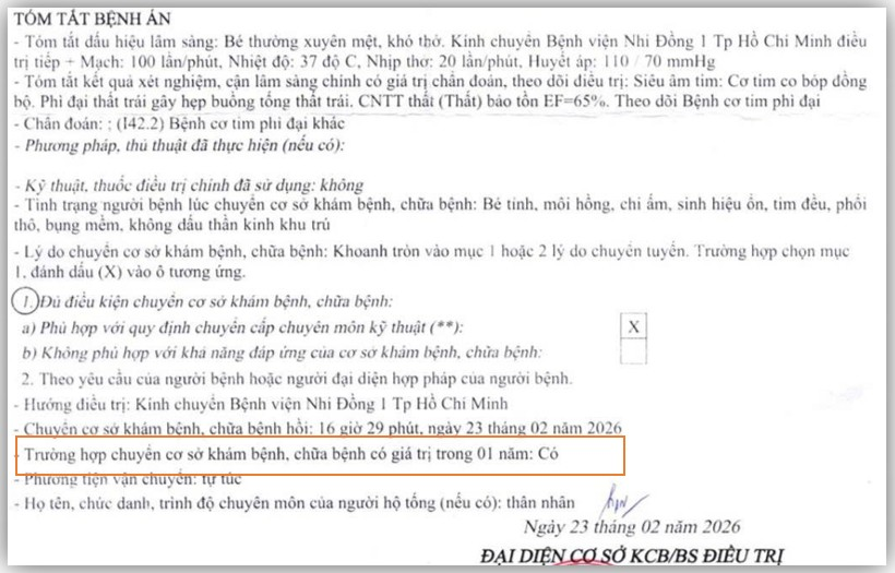 - Giấy chuyển tuyến khám chữa bệnh bảo hiểm y tế (Thông tư 01/2025/TT-BYT áp dụng từ ngày 01/1/2025) giá trị sử dụng 01 lần trong thời hạn 10 ngày làm việc có số lưu trữ và có ghi chuyển đến Bệnh viện Nhi Đồng 1.