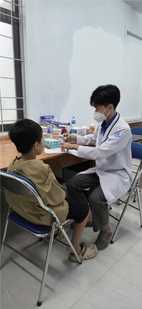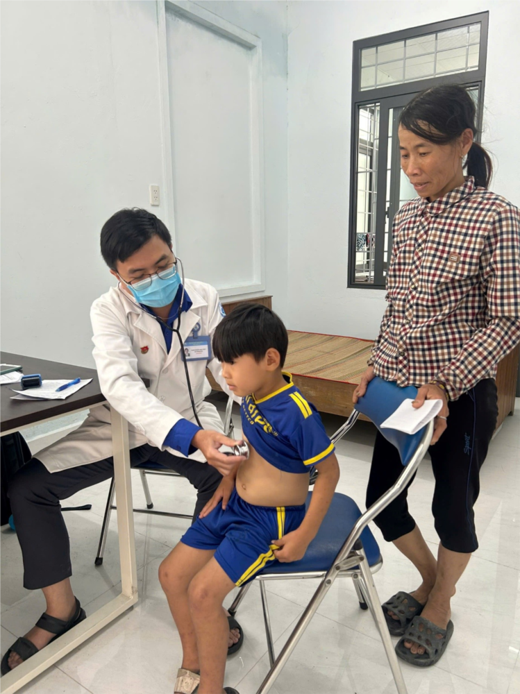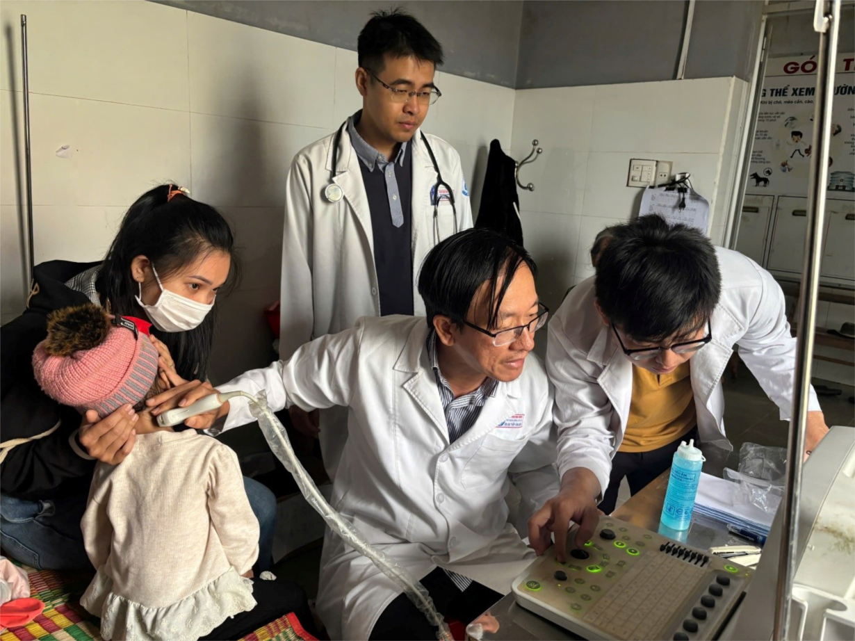 - Hình ảnh Bác sĩ Nguyễn Ngọc Phúc ân cần đặt ống nghe lên một em nhỏ có biểu hiện viêm phổi sau đợt lũ khiến ai nhìn thấy cũng thấy an lòng. Hay như Bác sĩ Hồ Nguyễn Thiện Toàn là một đoàn viên năng nổ của Chi đoàn Hồi sức Cấp cứu, dù còn rất trẻ nhưng đã dạn dày kinh nghiệm, kiên nhẫn thăm khám tỉ mỉ cho từng bệnh nhi. Đặc biệt, Bác sĩ Nguyễn Hữu Nguyên trong lúc kiểm tra sức khỏe cho một em bé được bà bế, nụ cười hiền hậu của anh đã xóa tan khoảng cách giữa thầy thuốc và bệnh nhân. Khoảnh khắc ấy, chiếc áo blouse trắng không còn xa lạ, mà trở nên gần gũi như người thân trong gia đình. Tại trạm y tế xã Sông Cầu, Các sĩ chuyên khoa 2 Trần Văn Định cùng đội ngũ bác sĩ tham gia chuyến công tác chăm chú quan sát màn hình chiếc máy siêu âm dã chiến đã không còn rõ nét. Dù thiết bị không hiện đại như tại bệnh viện tuyến cuối, nhưng với trình độ chuyên môn cao và sự tận tụy, các Bác sĩ đã không bỏ sót bất kỳ dấu hiệu bất thường nào. Những đứa trẻ được thăm khám, được cấp phát thuốc miễn phí, và quan trọng nhất trong hoàn cảnh lúc này là các bậc cha mẹ được tư vấn cách chăm sóc sức khỏe, vệ sinh phòng bệnh cho trẻ em và cả gia đình trong điều kiện sau lũ để tránh mắc phải các bệnh lý về hô hấp, tiêu hóa và da liễu.
