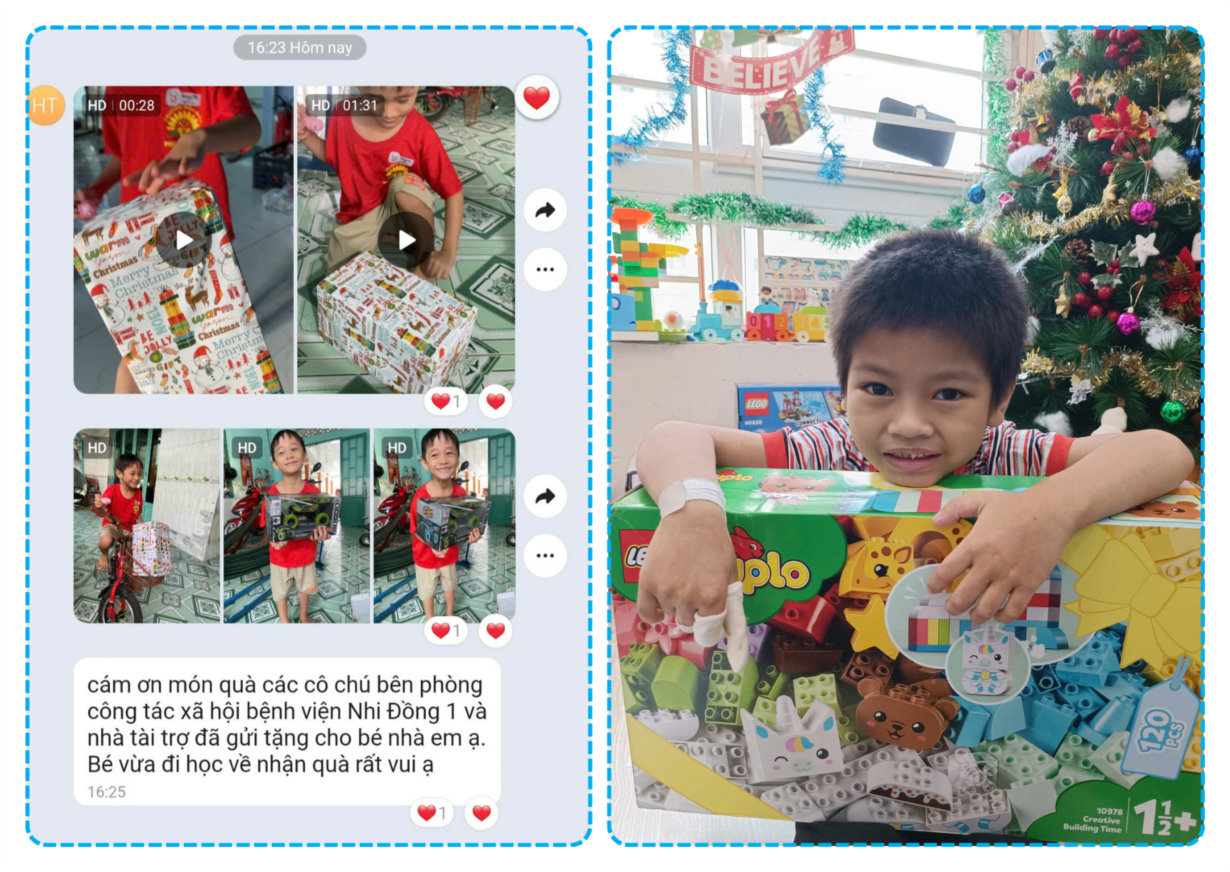 Trong không khí Noel, những phần quà Noel ấm áp đã được Bệnh viện Nhi đồng 1 phối hợp cùng nhà hảo tâm gửi tới tận nhà, trao gửi yêu thương cho các bệnh nhi có hoàn cảnh khó khăn đã điều trị tại Bệnh viện. Hoạt động không chỉ mang ý nghĩa hỗ trợ vật chất mà còn là sự động viên tinh thần, giúp các em nhỏ cảm nhận được sự quan tâm, sẻ chia của cộng đồng.