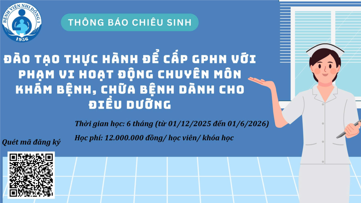 Bệnh viện Nhi Đồng 1 - Căn cứ Kế hoạch số 295/KH-BVNĐ1 ngày 21 tháng 11 năm 2025 của Bệnh viện Nhi Đồng 1 về tổ chức lớp “Đào tào thực hành để cấp giấy phép hành nghề với phạm vi hoạt động chuyên môn khám bệnh, chữa bệnh dành......
