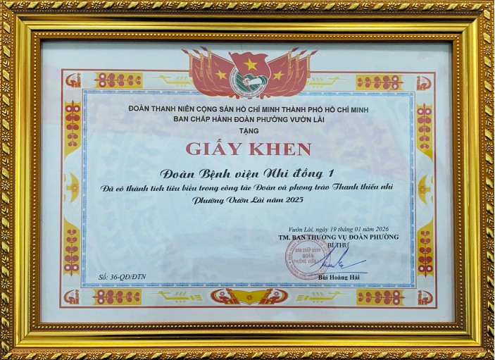 Ghi nhận những thành tích nổi bật trong công tác của Đoàn và phong trào thanh thiếu nhi, Đoàn TNCS Hồ Chí Minh Bệnh viện Nhi Đồng 1 vinh dự được tuyên dương, khen thưởng tại Hội nghị tổng kết công tác Mặt trận và các tổ chức chính trị – xã hội phường Vườn Lài năm 2025. Đây là sự ghi nhận rất xứng đáng cho những nỗ lực bền bỉ, tinh thần trách nhiệm và sự đoàn kết của tập thể đoàn viên, thanh niên Bệnh viện trong suốt thời gian qua. Đây không chỉ là niềm vinh dự, tự hào của tổ chức Đoàn Bệnh viện, mà còn là nguồn động viên quan trọng, tạo động lực để tuổi trẻ Bệnh viện Nhi Đồng 1 tiếp tục đổi mới nội dung, phương thức hoạt động, nâng cao chất lượng công tác Đoàn, góp phần thực hiện thành công nhiệm vụ chính trị của Bệnh viện, của ngành Y tế Thành phố và của địa phương trong năm 2026 và những năm tiếp theo trong sự nghiệp chăm sóc, bảo vệ và nâng cao sức khỏe trẻ em Việt Nam, khu vực Đông Nam Á và tầm nhìn quốc tế trong kỷ nguyên vươn mình của cả dân tộc.