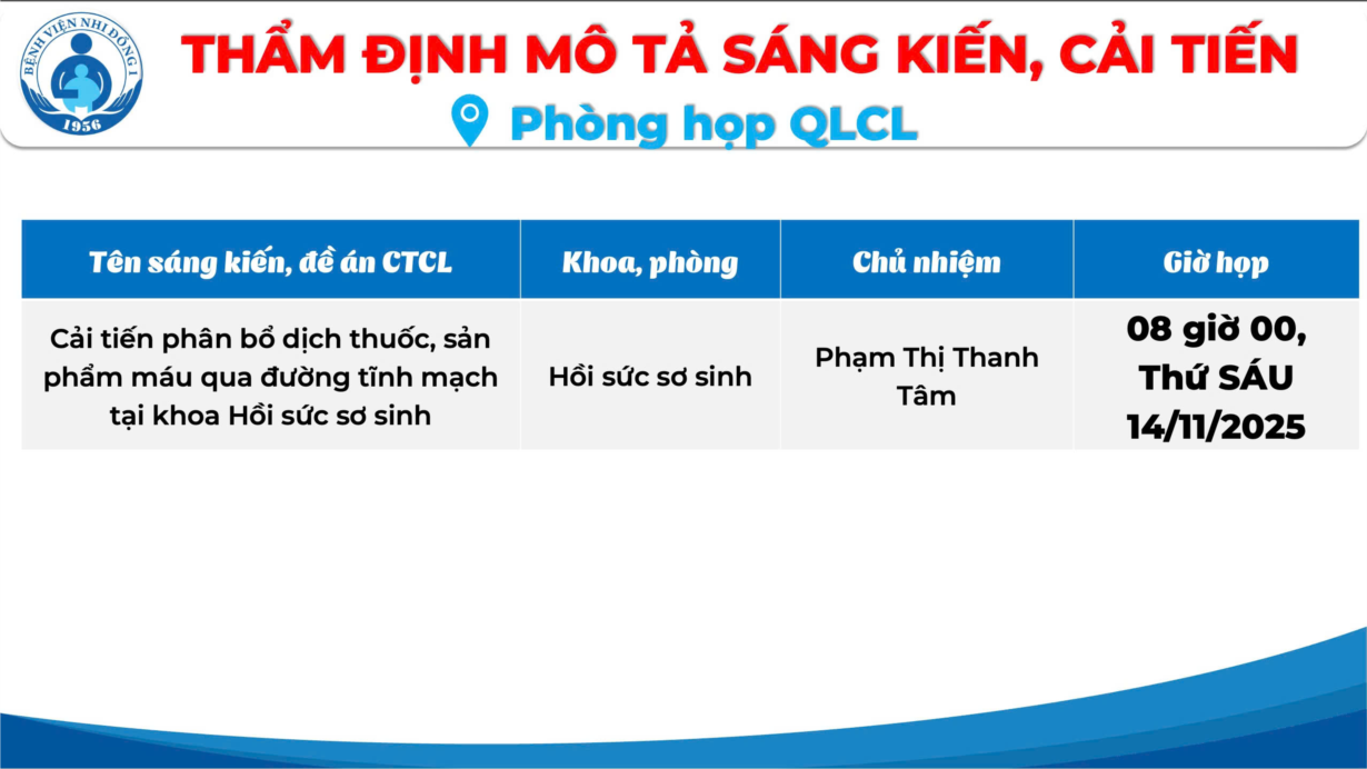Bệnh viện Nhi Đồng 1 - Thực hiện Quyết định số 3108, 3109/QĐ-BVNĐ1 ngày 05/9/2025, phòng Quản lý chất lượng tổ chức Thẩm định dự thảo mô tả sáng kiến và đề án cải tiến chất lượng Đợt 17&18 năm 2025....