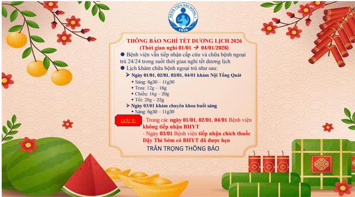 Bệnh viện Nhi Đồng 1 - Trong thời gian nghỉ Tết Dương lịch 01/01/2026 và Tết Nguyên Dán từ ngày 14/02/2026 đến 22/02/2026, Bệnh viện vẫn tiếp nhận cấp cứu và chữa bệnh nội trú 24/24 trong suốt thời gian nghỉ lễ. Thời gian khám......