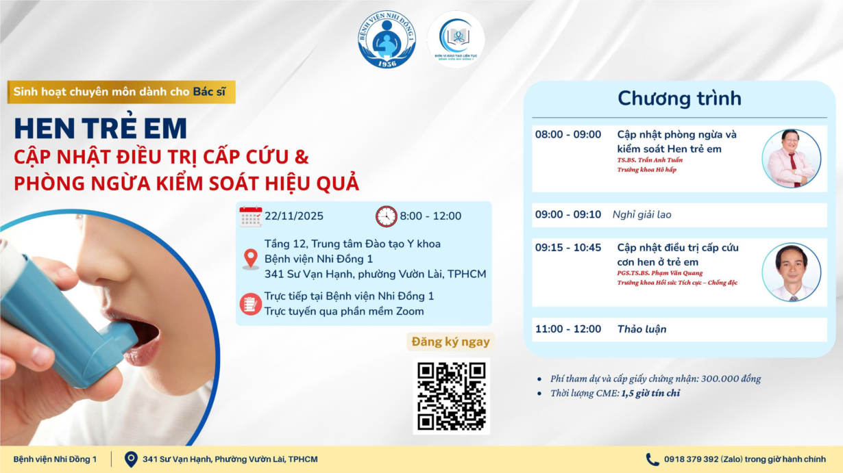 Bệnh viện Nhi Đồng 1 - Bệnh viện Nhi Đồng 1 tổ chức chương trình sinh hoạt chuyên môn chủ đề “Hen trẻ em - Cập nhật điều trị cấp cứu & phòng ngừa kiểm soát hiệu quả” sẽ là cơ hội để các Bác sĩ được cập nhật những kiến thức mới......